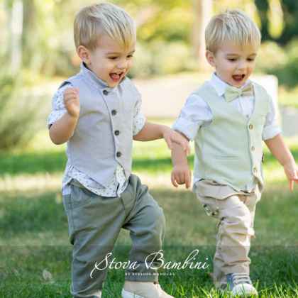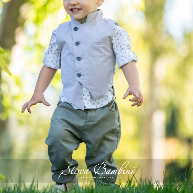 Εξαιρετικό κοστούμι βάπτισης με το νέο εντυπωσιακό σχέδιο γιλέκου της Stova Bambini σε έναν υπέροχο συνδυασμό με αποχρώσεις του χακί και της άμμου από εξαιρετικής ποιότητας βαμβάκι. Το πουκάμισο με ΜΑΟ γιακά έχει διακριτικό μοτίβο κύκλους , ενώ το σύνολο ολοκληρώνεται με χακί παντελόνι στο νέο σχέδιο Stova με λεπτομέρεια στο πίσω μέρος . Το σετ αποτελείται από 6 τεμ (γιλέκο, πουκάμισο, παντελόνι, ζώνη, καπέλο και διακοσμητική pochette) και μπορεί να συνδυαστεί άψογα με ασορτί χειροποίητα ανατομικά παπούτσια. Όλα τα υφάσματα των ρούχων είναι από υποαλλεργικό βαμβάκι 100% ή σύμμικτα υποαλλεργικά υφάσματα. Σχεδιάστε τη βάπτιση των ονείρων σας, κάθε ρούχο συνδυάζεται με ανάλογο φιόγκο για το κουτί ή την βαλίτσα σας, λαμπάδα, λαδόπανα, εσώρουχα, πετσέτες και σετ κολυμπήθρας (κεράκια-σαπούνι-μπουκάλι λαδιού), είτε διακοσμημένο και με το θέμα της επιλογής σας. Μέγεθος από 6 έως 36 μηνών, διαθέσιμο μεγεθολόγιο με διαστάσεις μωρού.