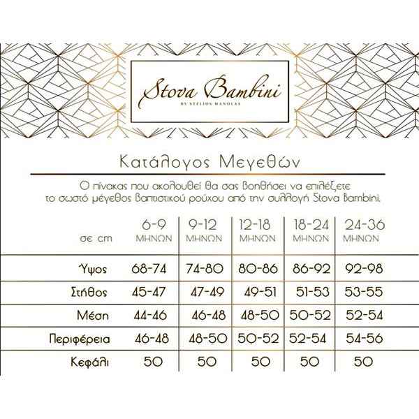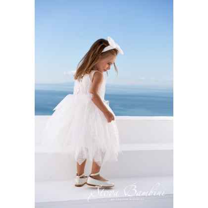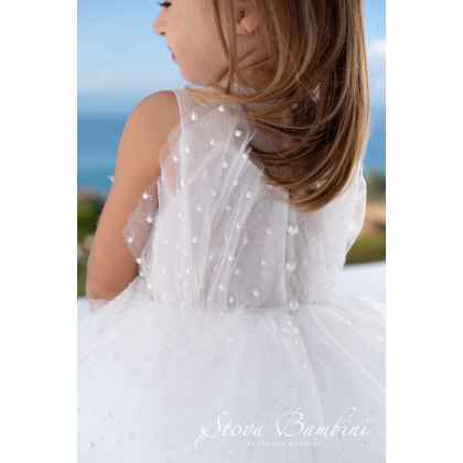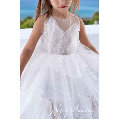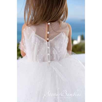 Ένα υπέροχο φόρεμα με διαφάνειες στο κορσάζ που δίνει την αίσθηση του στράπλες φορέματος αλλά είναι ντυμένο με οργανικό, βαμβακερό ημιδιάφανο τούλι και κούμπωμα στην πλάτη που το κρατάει σταθερό στο σώμα του παιδιού. Όλο το φόρεμα είναι διακοσμημένο από πουά κεντημένο γαλλικό τούλι και περιλαμβάνει υπέροχο φιόγκο κορδέλα μαλλιών. Εσωτερικά υπάρχει βαμβακερή, υποαλλεργική φόδρα και υποαλλαεργικό βαμβακερό τούλι. Tο συγκεκριμένο σχέδιο υψηλής ραπτικής διακοσμούν κομμάτια από τούλι που σχηματίζουν μικρό φουρό. Εκκεντρικό και ταυτόχρονα νεραιδένιο. Συνδυάζεται τέλεια με τα νέα glitter πέδιλα αποκλειστικό σχέδιο της Stova Bambini με vegan leather βραχιόλια στον αστράγαλο του παιδιού. Σχεδιάστε τη βάπτιση των ονείρων σας, κάθε ρούχο συνδυάζεται με ανάλογο φιόγκο για το κουτί ή την βαλίτσα σας, λαμπάδα, λαδόπανα, εσώρουχα, πετσέτες και σετ κολυμπήθρας (κεράκια-σαπούνι-μπουκάλι λαδιού), είτε διακοσμημένο και με το θέμα της επιλογής σας. Μέγεθος από 6 έως 36 μηνών, διατίθεται μεγεθολόγιο για να ελέγξετε τις διαστάσεις μωρού.