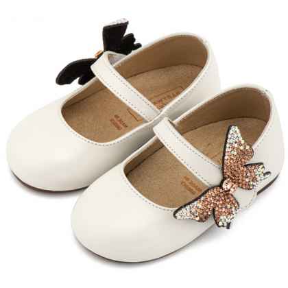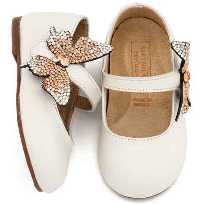 Δερμάτινο Γοβάκι με Στρασένια Πεταλούδα στο Πλάι σε Εκρού Χρώμα