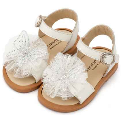 Δερμάτινο Πέδιλο Διακοσμημένο με Χειροποίητη Πεταλούδα και Τούλι σε Εκρού Χρώμα